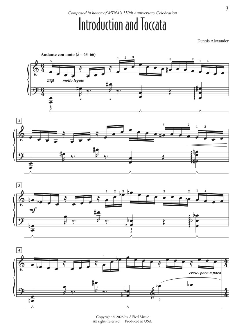 由知名教育作曲家丹尼斯·亞歷山大(Dennis Alexander)所譜寫的《序奏與觸技曲》(Introduction and Toccata),以一段充滿歌唱性(Lyrical)且富於表情的序奏揭開序幕,隨後發展進入激動人心、展現精湛技巧(Virtuosic)的終曲——這絕對是 進階程度(Advancing) 鋼琴學生展現實力的絕佳曲目。